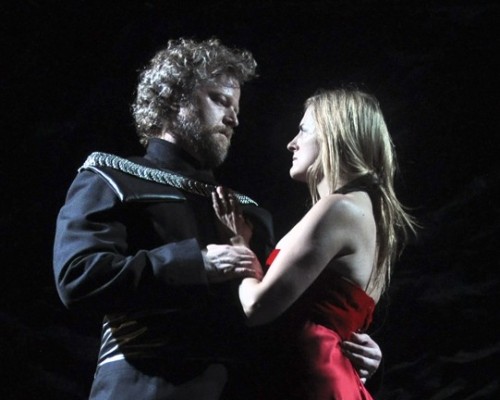 But then Gajic makes a terrible mistake by dumfoundingly dressing Lady Macbeth (Keira Naughton) in a strapless, red evening gown. In a setting so gray and devoid of color why opt to glaringly set her apart. You need sun glasses to look at her. It is the first of many details that are so hopelessly wrong about this Lady Macbeth.
