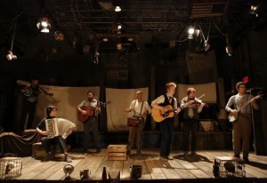 Eventually he showed up and proved to be the percussionist Arya Shahi who plays a minor character Cookie. Like the other six members of the ferociously egalitarian company they play a number of characters. While Shahi sticks to drums the others play a variety of stringed instruments; piano, accordion, fiddle, banjo, guitar, and tuned water bottles.