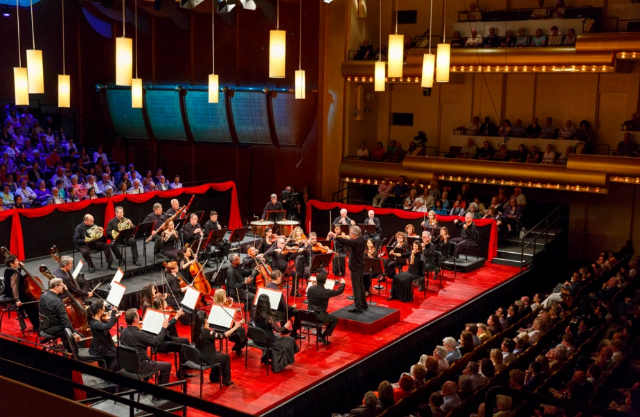 The acoustics of Geffen Hall are superb in the Festival configuration, enhanced by nineteen giant circles that hover over the orchestra and also by the audience itself seated on the stage. The proscenium is thrust out into the main floor seating, with a golden glow cast by ceiling lamps over the stage. It is hard to remember that the Hall has been criticized for its acoustic failings.