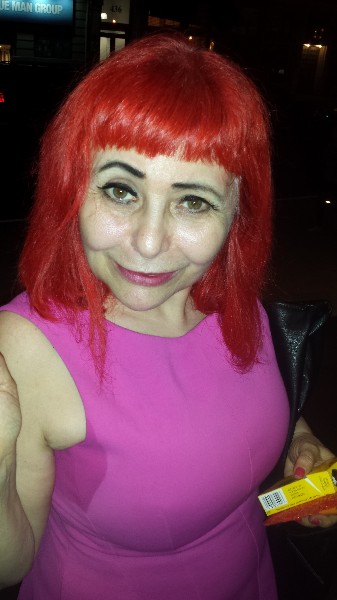 Essentially a nightclub with tables and booths surrounding a stage, Joe’s Pub, where drinks and food are served during performances, attracts a great many cutting-edge performers—artists, actors, singers, musicians, as well as a hot, hip and happening audience. The night I attended, many familiar faces, from the artist Colette, to performance artist John Kelly, all wanting to see what Arcade has to say, peppered the theatre. As is her style, with a mike in her hand, a full 30 minutes before her show began, Arcade, playing the Mistress of Ceremonies, was busy directing traffic, welcoming friends.