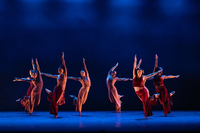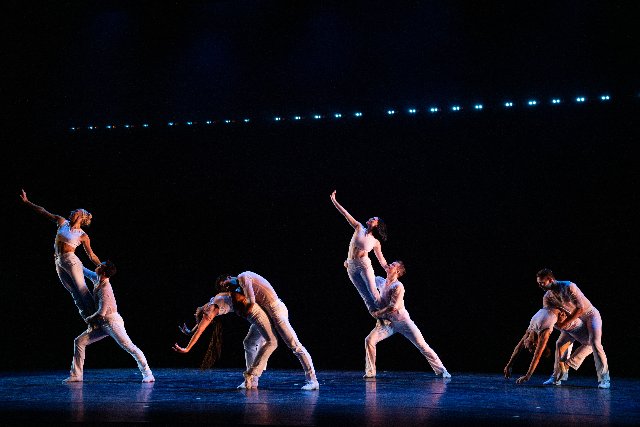 The program began with an ensemble work Swing Shift (2003) by Parsons set to music, violin and piano, by Kenji Bunch. It starts with a tall female dancer striking iconic poses. They might have been sculptures of goddesses. The pace of the music was subdued as she is then swathed by and blends in with the company. There is a gasping device as other dancers take lead and then vanish to be replaced by another. This quick switch is accomplished by the masterful lighting of Binkley. As the piece evolved there were many combinations of solo, duet. trio and quartet. The dancers constantly morphed and regrouped with mercurial fluidity.