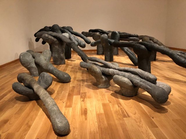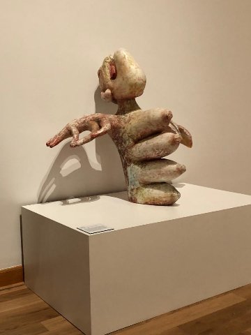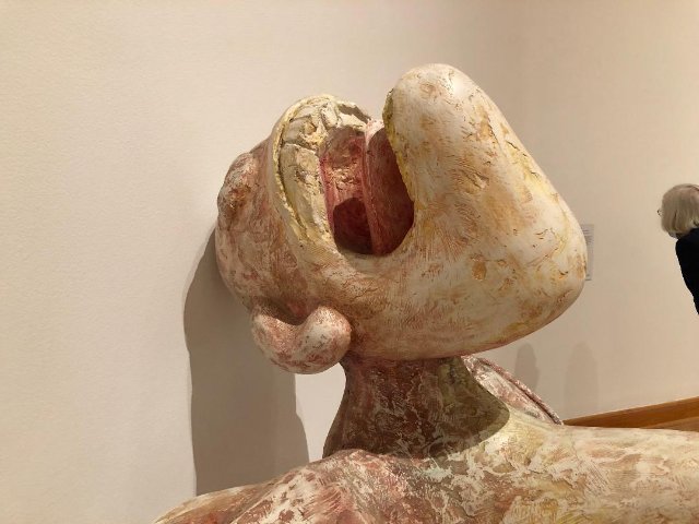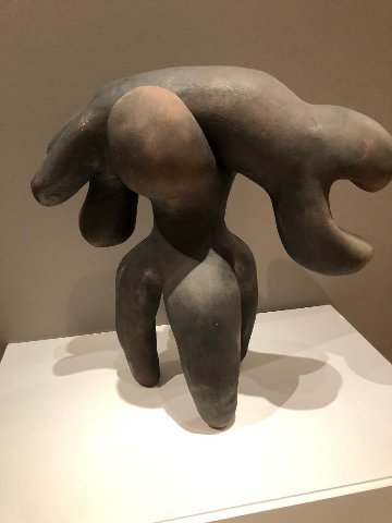 A key work in the exhibition is the gut-wrenching Supplicant (1985), an expressionistic sculpture created with hydrocal, a super strong version of plaster. A head is thrown back, its mouth open in extreme anguish. The torso is made up of a vertical row of four bullet-like breasts. It evokes Diana of Ephesus, the fertility goddess, though with myriad breasts.