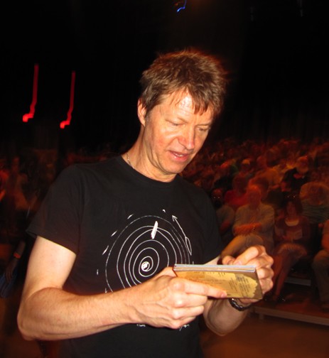 After the mediocre and enervating music for most of the evening The Books were just terrific. They got a huge ovation when they opened by stating “It’s good to be playing in our home town.” The Books are an American folktronica duo, formed in New York City in 1999, consisting of guitarist and vocalist Nick Zammuto and cellist Paul de Jong. Their releases typically incorporate samples of obscure sounds and speech. They have released three critically-acclaimed albums on the German label Tomlab, and recently released their fourth studio album, The Way Out, on Temporary Residence Limited.