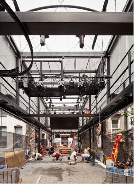Set on a vacant lot between two tenements, on the border of New York City's urban textured Lower East Side and the Bowery, the first of the planned Labs occupies a narrow, block-through 75 year old parcel enhanced by a public garden space along gritty Houston Street and 2nd Avenue.