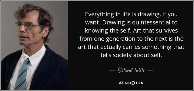 The Tuttle that Addison owned, if my memory serves me, was a not very large oblong rectangle drawing on a rectangular piece of plywood that is to be exhibited nonchalantly on the floor leaning up against the wall. According to Addison, gallery goers felt compelled to report to the gallery director that it had fallen off the wall. I think Tuttle wanted to kick the experience of drawing off the wall out of the realm of framed paper and into the space of the pedestrian (both meanings) where it gets accidentally kicked. I saw a Tuttle show in NYC with Addison that I did not “get”. Mixed media with no attempt to make parts react to a whole. The Hegelian dialectic has until recently directed my own work and its absence in Tuttle irked me to protest the validity of much of what Tuttle does. Addison had to tell me to shut up.