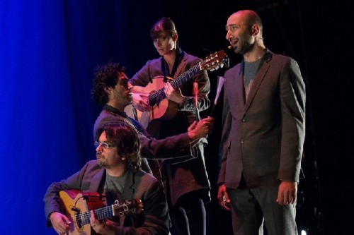 The man, Miguel Media, standing to the side touching her shoulder departs behind a scrim which silhouettes two guitarists, Caroline Plante and Jose Vega, as well as the baritone singer and co-artistic director, Hedi Graja. Medina takes his place as percussionist.