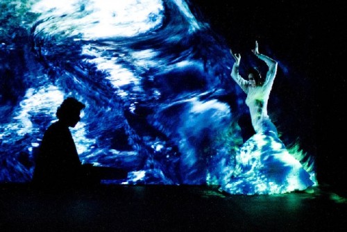 There were stunning elements. With bare feet Allard performed as the ocean/ tide in a dress with a long train. In traditional flamenco the women have precise moves to kick and maneuver these trains alternating with heel clicking. She focused entirely on the manipulation of the skirt stretching out into long angular poses accenting the horizon line of the pulsing video of waves projected behind her.