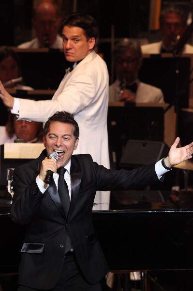 Over the orchestra playing “Strike Up the Band” we first heard but did not see Michael Feinstein. After an introduction by Lockhart he entered singing and took over at the piano. He would return to the piano several more times during the evening alternating with his accompanist Tedd Firth.