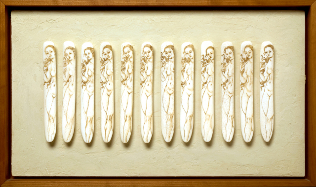 Reflecting on the ancient whaling tradition she has created works like "A History of Cloning (The Creation of Eves)", a set of scrimshaw pieces framed as one work on twelve pieces of bone.