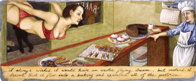 There is a flavor of erotica as nude women are ravished by giant lobsters.. They also float and fly as in "Flying Dreams in the Dunes" or "Flying Dreams; Invisible." Her evocative work does indeed take flight.