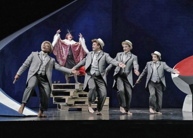 For the “opera” act, this production offers a sleek, cool, futuristic look in blue with red highlights, but the look can’t conceal structural weaknesses. Conceptually, the simultaneous performance of the two entertainments is to save time, yet very little simultaneity occurs. What’s more, the drama overwhelms the comedy, so that the comedy seems an unwanted intrusion. Ariadne’s opening soliloquy seems endless and static and is punctuated by mugging from the comedy’s barbershop quartet which disrupts the drama of the aria. But what does comedy do to elevate dramatic situations and music? Since comedy will not enhance drama, the balance would work better if dominated by the comedy. The concept would also be better served if the composer had given us counterpoint ensembles between members of the two troupes, especially a septet between the nymphs and the barbershop quartet.