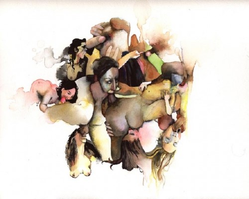 Speaking of which, one of the only taboo ones left is explored in lurid detail by Lauren Salk. Her small, deft paintings and drawings all have one theme: women offering oral sex to males, in images that must use as their sources either amateur or professional pornographic photography. What's fascinating about this obsessive theme (which she realizes in a dizzying variety of media) isn't just that it's taboo; it's that, though small, her works explore the sex acts in such abundance.