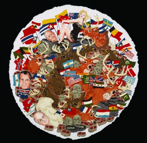 While the abstract works are beautiful, it's the figurative and representational choices in the show that shock and viscerally engage the viewer. Kirstin Lamb's humorous gouache tondos are framed with elaborate old-fashioned carved gold. This quaint presentation fits the all-American images inside, which mix-up three very basic American things: sex, politics and fresh meat. "Trophy Flagpile" includes portraits of Nixon and Dick Cheney, amidst many references to guns and hunting, in a tangled morass that is topped, naturally, by a provocatively posing Marilyn Monroe. Lamb's ironic and faux-primitive application of gouache gives a crude sort of cartoonish cohesion to the midden of pop and politico culture detritus she assembles. Her works are full-color caricatures of our tacky and unfortunate national obsessions.