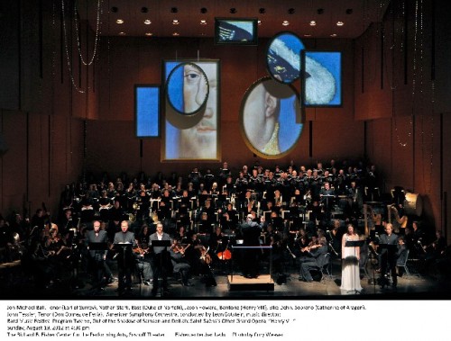 The concert performance at Bard was accompanied by projected graphics in picture frames at the top of a packed stage. Many horns were added for the pageantry the composer provides and a chorus was led by James Bagwell.