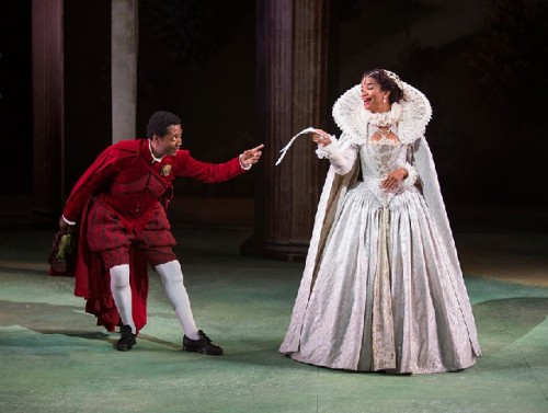 The creative team led by director Lamos is first rate. The gorgeous costumes designed by Linda Cho fill the stage with a palette of colors. From dazzling red and sparkling diaphanous white, and long pink flowing gowns to the rich looking blue doublets and cloaks – costumes of the aristocracy – coupled with the contrasting scruffy-looking brown costumes of the outlaws renders the stage design by John Arnone, awash in color. The lighting design by Stephen Strawbridge and the sound design by Acme Sound Partners, further enhance the vision of director Lamos, who stages his production with a sure and steady hand.