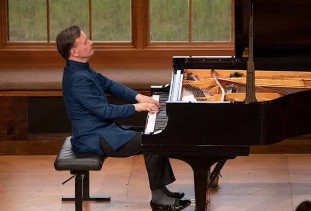 The first weekend of the 2023 Music Festival started with a performance by Sir Stephen Hough. When he was recently knighted by King Charles, the King whispered that he was grateful for the joy Sir Stephen brings to eager ears. And joy he certainly delivered in a concert that ranged from Frederic Mompou, a composer who Hough has brought to the music world’s attention, to Debussy’s Estampes, which sank us into the multi-paneled mountain landscape on display in windows behind the performer.