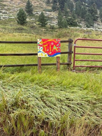 During off-season, children from local schools visit and learn. The neighborhood is swept up in the place. A sign made by school children lights up a fence. The wonderful paintings by Cathy Halstead are often filled with the geometric figures of nature and colored brightly in a palette of reds and yellows. I’d bet that the school children were given ‘Cathy colors’ to make the bright sign. It is a perfect welcome to Tippet Rise.