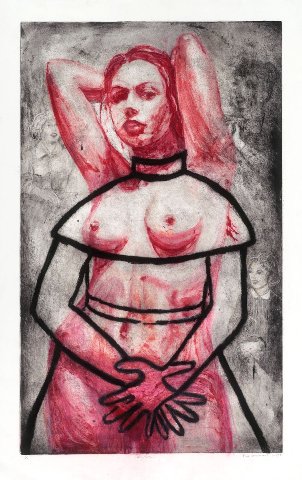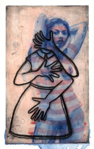 The dichotomy of Desire/Shame resonates with Hamermesh’s monoprint process: where painterly watercolor transfers collide with delicate chine-collé, finely incised drypoint marks, and boldly textured carborundum. In MeToo (1) & (2), a figure in cool blue tones, perhaps deanonymizing the objectified nudes of Yves Klein, is offset by a black carborundum contour in the form of a dress with multiple arms and hands. The direct gaze of the figure imbues power, yet the hands introduce an internal/external struggle between protection and exposure of the body. Hamermesh is not offering answers to trauma, but instead encourages conversation that explores visually, the complex ways trauma is brought to light.
