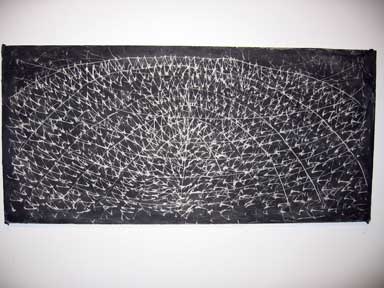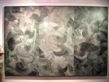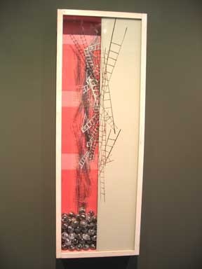 Riley installed a variety of works from paintings and prints to sculptural objects. The imagery sources from snowflakes to lace patterns, delicate grass-like arrays, and the linear tracks of a kind of driven spider. The largest work, a painting of clusters of intersecting linear markings is impressive in its detail and scale. Having seen his show at Kolok gallery earlier this summer which featured black and white pieces very remindful of blown-up microscopic images of snow, this work has more depth and speaks of more heady perceptual phenomena. The prints are delicate, intricate and command a visual specificity that was lacking in the earlier pieces. They are almost like a residue left by the behavior of a small creature, like tracks. The scultural works have some of the same whimsy about them but are darker in affect. One relief work seemed to be the body of a bird splayed on the wall, while another sprung away from the wall in a burst of metal rods like a magnetic explosion.