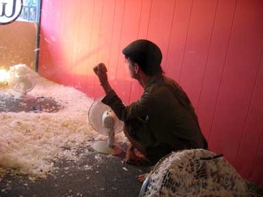 filled the two store-front spaces with feathers, and using fans, attempts to