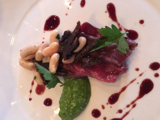 Dish: Cured and olive oil marinated Angus beef on top of a bean salad and Malbec glazed sauce.