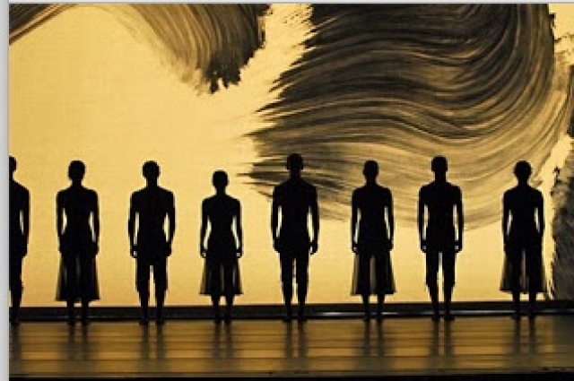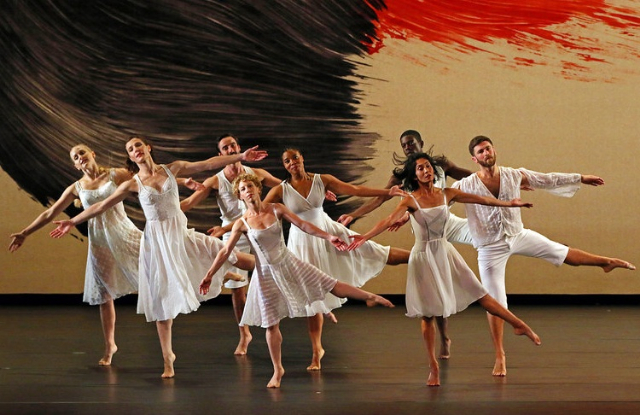 Howard Hodgkin has created a set which most often shows three giant brushstrokes bathed in different colors. Are they the fast, slow, fast of each of the Mozart compositions? The dancers stand silhouetted before the backdrop and then jump forward into the light.