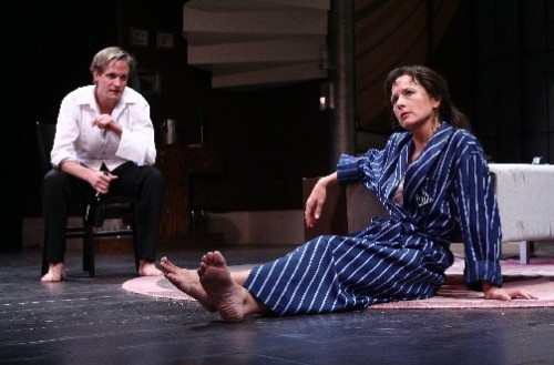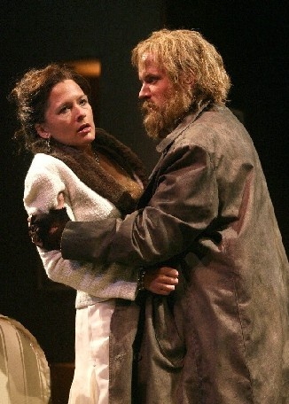 By the second scene the transformation begins. He has been scrubbed clean and redressed in her husband's attire in which he makes a striking resemblance to the deceased. Which is why she had stalked him in the first place. The role for Letscher is challenging. He must morph from a desperate homeless man and drunk with a thick Scottish accent into the charming and urbane dead husband. There is a Shavian twist as he must be transformed into the man of the house. The playwrights take that "Pygmalion" reference head on.