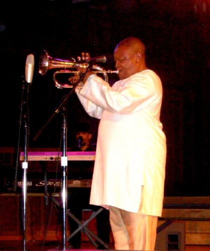 The double header of South African trumpeter, Hugh Masekela, and his Capetown combo, in tandem with the sizzling salsa of conga player, Pancho Sanchez, and his eight piece Latin band proved to have more pop and home runs than the recent flopperino of the swooning Red Sox getting pummeled head to head by the Yankees. The Sox took another dive last night but we tuned them out to imbibe in the hot music on a cool night with the launch of the Labor Day weekend long Tanglewood Jazz Festival.