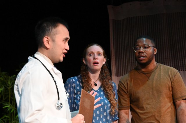 So where does this all go? Humorous and conflictual incidents amass. Positions of parties shift. And curious and unanticipated turns take place with the pregnancy. The constant is the bumbling Dr. Hoskins, whose lab is responsible for the mix-up. The character is acted with appropriate antic humility and stuttering, plus evasive and nervous-smiling apprehension by John Charles Quimpo.