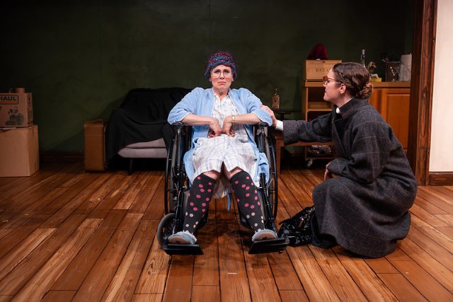 The siblings wax nostalgic while unpacking the stuffed animals of their fraught childhood. Phyllis is in a snit taking a flask of gin from a large handbag with fragments of her peripatetic life. "I need ice" she demands while miraculously Martha extracts an ice tray from one of the boxes. It is one of many such comic incidents with which Vogel softens the harsh edge of tragedy. The writing swings from bathos to slap stick.