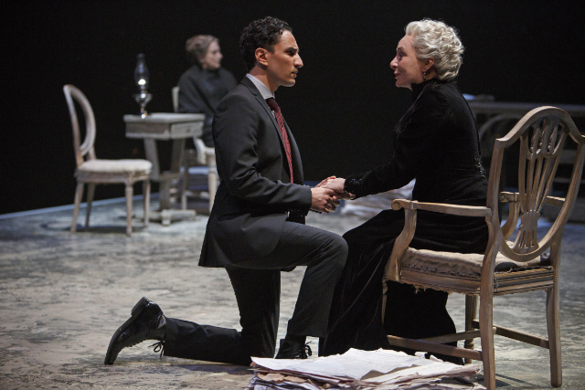 Seana McKenna’s Ella is a more varied, dynamic role, passionate in loving memories as well as antagonistic ones, but she too demands our constant attention, and ages and weakens at the end by will, not any change in outward appearance. Joseph Ziegler’s Vilhelm Foldal is so open and honest in his heartfelt responses that I believed and liked the man, despite the fact that he seems to be written as a fool. And in the small role of the sexy, freewheeling Mrs. Fanny Wilson, Sarah Afful makes a strong impression as a willful, no-nonsense powerhouse. I did want the play to end, but I appreciated the chance to applaud the performance.