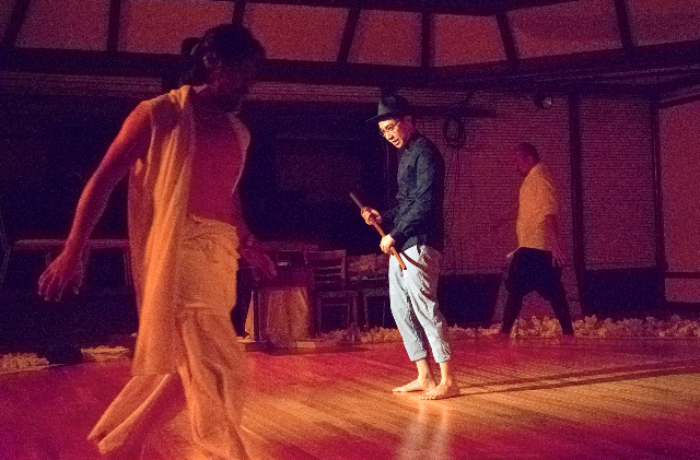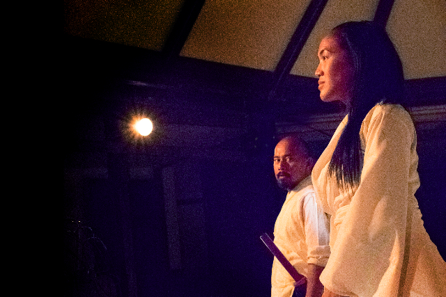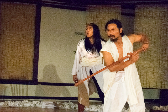 Four everpresent actors constantly stalk the space engaging in lies and confrontations. The cast is superb in look and in performance. Jomar Tagatac is imperious and commanding as the samurai. Ogie Zuleta is earthy and monkey-like in his movement as the bandit. And Christine Jamlig is assertive and sometimes hysterical as the lady. Against these harsh characterizations, Steven Ho conveys a bemused innocence when he wanders about as the story’s author, Akutagawa. His presence also provides comic relief from the fierce passion of the others.