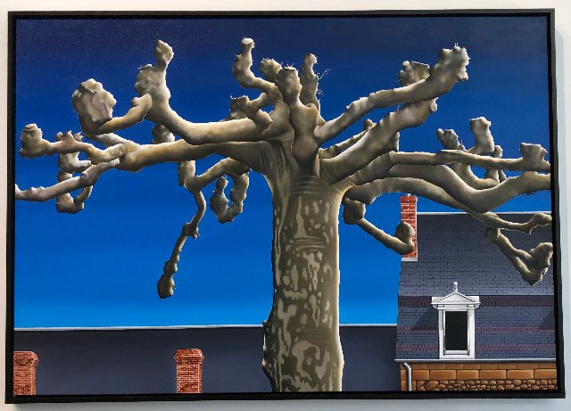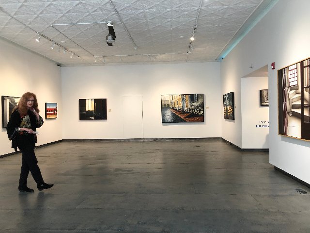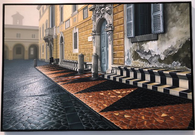 Most of the subjects in this show entail rendering of photos she took during their annual trips to Europe. Back in the studio she grids the image and transfers the drawing to canvas. The paint is built up in progressive layers resulting in compelling chiaroscuro.
