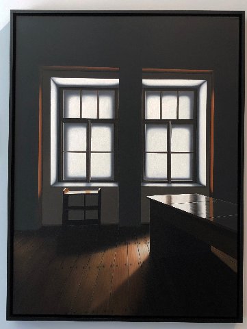 The paintings are stark and minimalist. The hard surfaces of walls and floors, with crude furniture and bunks, take on an abstract quality. Side by side one interior is cool while the other is warm. As adapted spaces they retain skylighting. This makes the views deceptively benign.