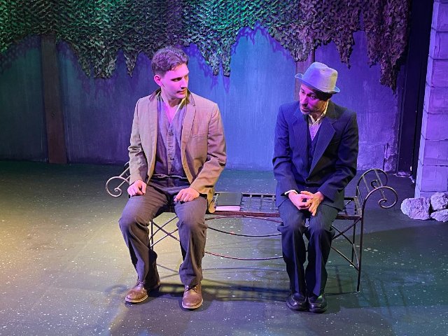 John Santos, the production’s co-producer, usually plays Max’s “Uncle Freddy.” But for the reviewed performance, the co-production’s assistant director, Chris Ruggere, stepped into the role. “Uncle Freddy” is gay. However, he pretends to be straight in order to remain in favor with his wealthy family, who disowned Max due to his sexual orientation. Ruggere, wearing a hat, played the uncle appropriately as somebody who is clearly hiding something.