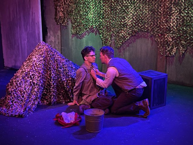 Buzzeo not only directs and acts (as an effeminate Greta), but he has designed the set and period costumes. The sparse, yet appropriate set design features two grey walls upstage, reinforcing the material’s darkness. A tall, dark fence serves a similar purpose. In addition, the set includes period details.