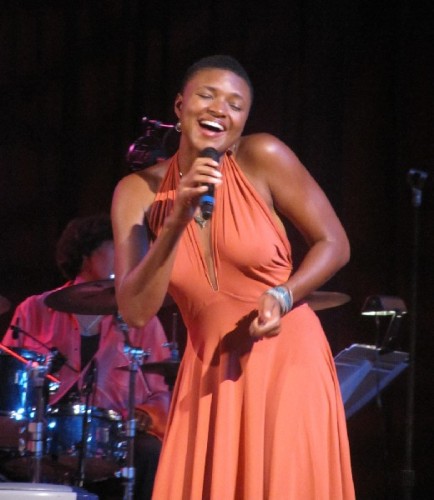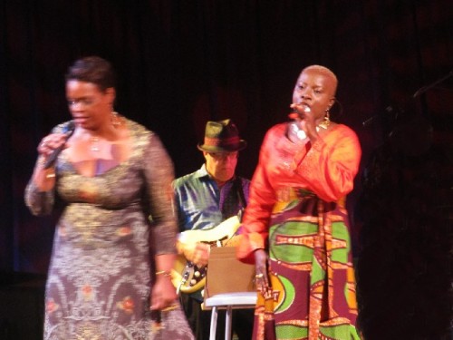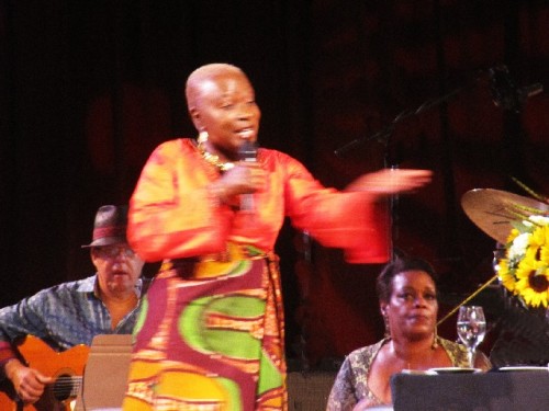 A petite woman dressed in a richly patterned, long African skirt with an orange top she often danced as well as sang. She spoke informatively and interacted well with the audience. She described how her father introduced her to many different genres of music. From her mother she learned that music is universal and has no nationality, race, or color. It appeals to and is understood by all people. She also made a special tribute to the late Miriam Makiba the best known of modern African singers. “It is because of her that I am on stage today” she said.