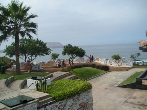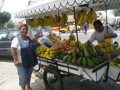We went out for a stroll. Every block of the main street in Miraflores seemed to be populated with moneychangers. Business was brisk, as these men offered a better exchange rate than the banks. They examined each dollar to avoid counterfeit money and rejected bills that looked worn. We strolled on, admiring African tulip trees with bright orange flowers. Their bulbs stored water, which jetted out like water pistols to compensate for the dry heat. Lima, 80 meters above sea level, has a desert climate. We stopped by a vendor's cart stacked with gigantic avocados and mangoes. Walter introduced us to chirimoya (custard apple). It was delicious.