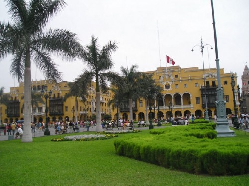The Cathedral dominates the eastern side of the square; next-door is the Archbishop's Palace with an impressive wooden balcony; opposite stands City Hall; and police in tanks guard the Government Palace on the northern side. Nearby, the Monastery of San Francisco faces a small paved square full of pigeons and vendors of votive offerings. The interior of this jewel of colonial Lima is decorated in the geometrical Andalusian Moorish style. Its carved wood and plaster ceiling, Spanish tiles and religious paintings are outstanding. The building's four levels of catacombs, which were used as Lima's cemetery until 1810, contain hundreds of skulls and bones stored according to type. The National Museum of Anthropology and Archeology at Bolivar Square has a superb collection of pottery and textiles from all main cultures of ancient Peru: Chavin, Moche, Chimu, Tiahuanaco, Pucara, Paracas, Nazca and Inca. They are laid out chronologically.