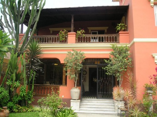 Early in the morning I explored the hotel's premises. It felt good to be in short sleeves and sandals. The rooms of the lovely colonial building faced a sun-splashed courtyard. The building sat back from the street in a garden of lush foliage with decorative earthenware pots that added to its charm. Antigua Miraflores, named after its fashionable neighborhood, was our home for three nights.