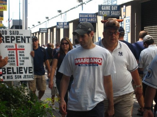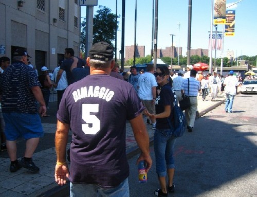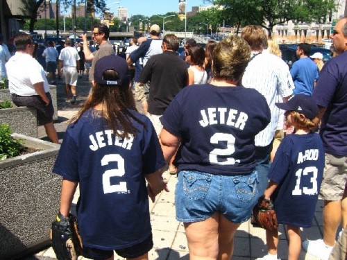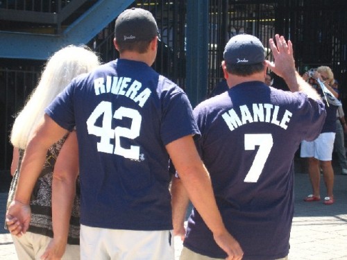 It's those countless legendary players and plays and moments and games which give the Stadium an unmatched mystique and place in baseball history. But watching the backs of the souvenir t-shirts worn by the fans, it's obvious that four numbers are the ones that really count. 7, worn by Mantle. 5, worn by DiMaggio. 4, by Lou Gehrig. And of course the Babe's 3. Of the current crop of players, Derek Jeter's 2 is the big one with the crowd, easily topping A-Rod's 13.