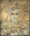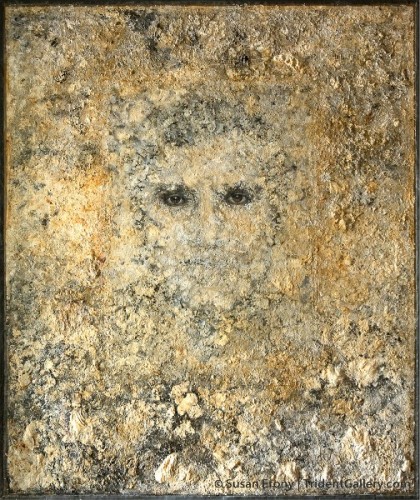 Erony’s unseeing eyes, unspeaking lips is a profound work of art about the contrary imperatives of emotional safety and moral awareness, and about the practical dilemma of when to feel and when to shun feeling. The rosy beauty in this painting seduces us, as surely Erony intends. Spend time with it, and before long, the fresh entrails on blackened ashes — a burnt offering, a sacrifice, an image of the pyres of Treblinka — or else an image of a mind stripped of its sensibilties: a brain stripped of its organs of sensing — before long, I say, one forgets to see the carnage (even as it thickly protrudes off the canvas), and disgust gives way to the appreciation of beauty. The most confrontational piece in this exhibition may also be the most beautiful — lips and eyes in starry array, fringing into gorgeous depths of space. Through this stark contrast of moral ugliness and visual beauty, unseeing eyes, unspeaking lips invites and allows us to experience directly and self-consciously the contrary consequences of art’s transmuting mediation between the viewer and the world: that is, to experience both art’s welcome capacity to provide a safe or at least more tolerable means of encountering difficult truths, and simultaneously to experience art’s complicity with that flinching part of human nature which recoils into the comforts of falsification and the safety of disengagement.