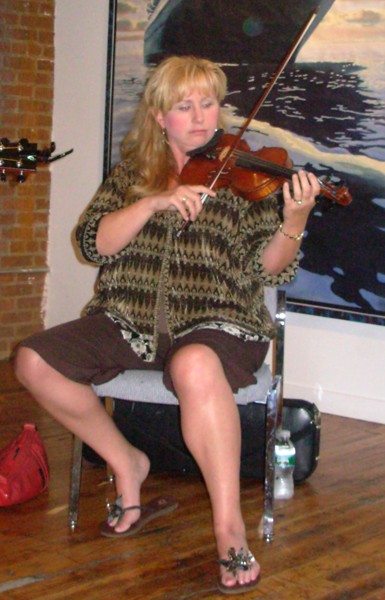 Actually, this proved to be a relatively rare appearance by the full Flown Home Band. All of the musicians appear in other combinations. Currently Fran and Lisa appear regularly as the Bee Line Ramblers. The duo is named for their vintage camper. Lisa has recorded as the "Ravin Mavins." While Tony and Josh perform with "Flying Garbanzos." Josh plays percussion with all different kinds of combos including rock bands. On this occasion Eileen Markland was sitting in on violin. She performs classical music throughout the county. Markland explained that she took up fiddle as the result of an improv class, and though classically trained, came to enjoy the spirit and freedom of folk and bluegrass music.
