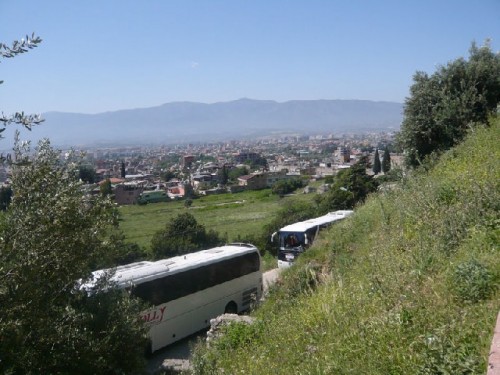 The breakfast buffet introduced us to regional specialties in addition to the regular fare of cheese, olives, tomatoes, cucumbers and fresh bread from the bakery. Two that stand out are: zahter, cumin ground with sesame seeds, enjoyed with chunks of bread dipped in olive oil; and hazelnut spread with molasses, made by boiling grape juice and thickened with yeast. Following our bountiful breakfast, we set out for our day's journey to Antakya, ancient Antioch, located in the Orontes valley at the foot of Mt.Silpius, 25 kilometers from the Mediterranean and 50 kilometers from the Syrian border.