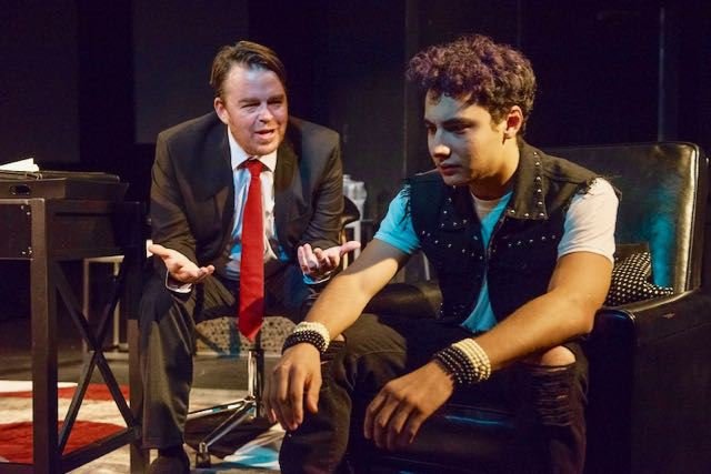 J.B. Benton (Ira Amyx), a lawyer in the prosecuting attorney’s office, is the central character. He’s working at home because his artistic musician son, 16-year-old Eddie (Joshua Zambrano), is suspended from school for beating up another student who had been bullying him. J.B., who drinks Scotch or vodka straight up throughout the day, checks in frequently at the monger website, frequented by men seeking teenaged girls for sex. (They call themselves “hobbyists.”) The chat transcript, projected on large screens, is graphic and ugly.