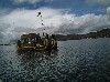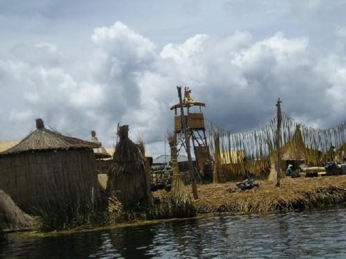 On our final day in Puno it began raining hard. Nonetheless, we headed out as scheduled to the Uros Islands, where the Uros Indians live on "floating" islands made of reeds that grow in the lake's shallow waters. The boat docked at one of the islands, where we had a demonstration of reed construction. Men dive for the spongy part of the reed roots, which they then strengthen by putting ropes through big square chunks. After tying the chunks together, they place cut reeds over them in a criss-cross fashion. Once the island's foundation is set, houses, also made of reeds, are set up. The islanders dwell this way to avoid paying taxes. They fish by stretching nets between sections of the islands, and hunt birds with self-made guns from metal pipes and balls of pellets.
