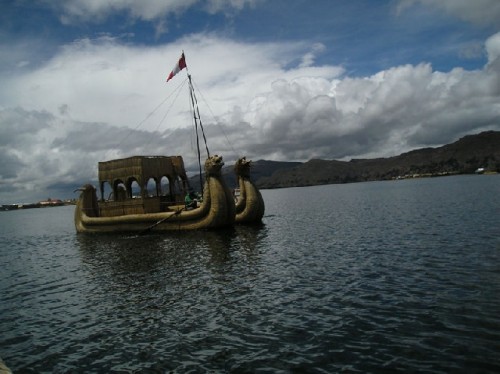 Lake Titicaca, meaning "wild cat" in Inca, derives its name from its puma or mountain lion shape. For the Inca the puma represented this world, the condor the heavens and the snake the underworld, with the three together creating harmony. According to legend, a pair of gods rose from the waters of Lake Titicaca to found the Incan empire. The lake is 103 miles long, 37 miles wide and 900 feet deep. During the rainy season the water rises 7-8 feet. Surrounded by the Andes, it never freezes, and its temperature varies between 45 and 50 degrees F. Twenty-five freshwater rivers, seven of which are quite big, pour into the lake. Puno, a city of 170,000 people, serves as its harbor, with fishing as the main industry. There are many trout farms on the lake, some of which are owned by Chileans.