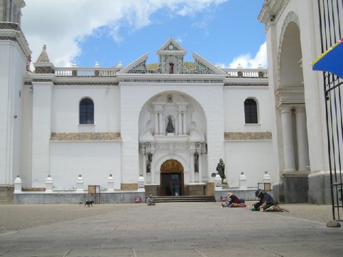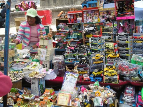 Copacabana is a pleasant town of 15,000 Aymara-speaking people on the Bolivian side of the lake. It is famous for its cathedral containing a 16th-century carved wooden figure of the Virgin of Copacabana, the Christian guardian of the lake. Except during Mass, the statue stands with its back to the congregation, and faces the lake so that it can keep an eye out for approaching storms. The door of the cathedral has elaborately carved wood panels that show the laborers building the church. As a religious center for Catholics, it is a busy place to express wishes. Outside vendor stalls are stacked with goods that might help fulfill a wish: small model houses, cars, diplomas, suitcases etc. A long, narrow room with walls covered in candle wax is filled with flickering votives of various colors.