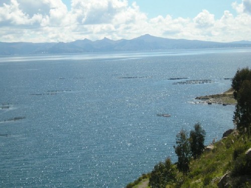 In the morning we departed for the Bolivian border. On the way we passed by large rocks that to native imagination evoke animals: snail, elephant, guinea pig and rabbit. We climbed the back of a long "snake" and walked its entire length, from its tail, stopping midway to meditate at the very sacred spot where natives blow coca leaves to the surrounding mountains. Since the snake sheds its skin, it is a sacred animal for the Aymara, who believe in reincarnation. Their beliefs include layers of superstition, such as burying the dead in their backyard to be protected by the ancestors. Over the fields we spotted Andean black ibises and humming birds looking for worms. We continued our ride by the side of the lake, which is divided almost midway, with 60% in Peru and 40% in Bolivia. The coast guards of both countries monitor the border, marked by an imaginary line between two mountain peaks. Trout farms dot the lake because kingfish eat the wild trout. Andean gulls hover over the lake to get to the trout as well.