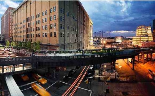 The High Line which runs close to the gallery displaying these images, is photographed facing west. Tucked into the left of the frame is a stadium seating area where people can observe the street. The High Line is an intimate industrial city park. When you walk it, it hugs you with reeds and grasses. Way in the background in the middle of the picture is the Chelsea Piers driving range with netting rising high enough to keep golf balls from falling into the Hudson and knocking out fish. A taxi streaks into the night, a slash of color much like movement created by a Franz Hals brushstroke. Some light lines in the center of the structure are mysterious.